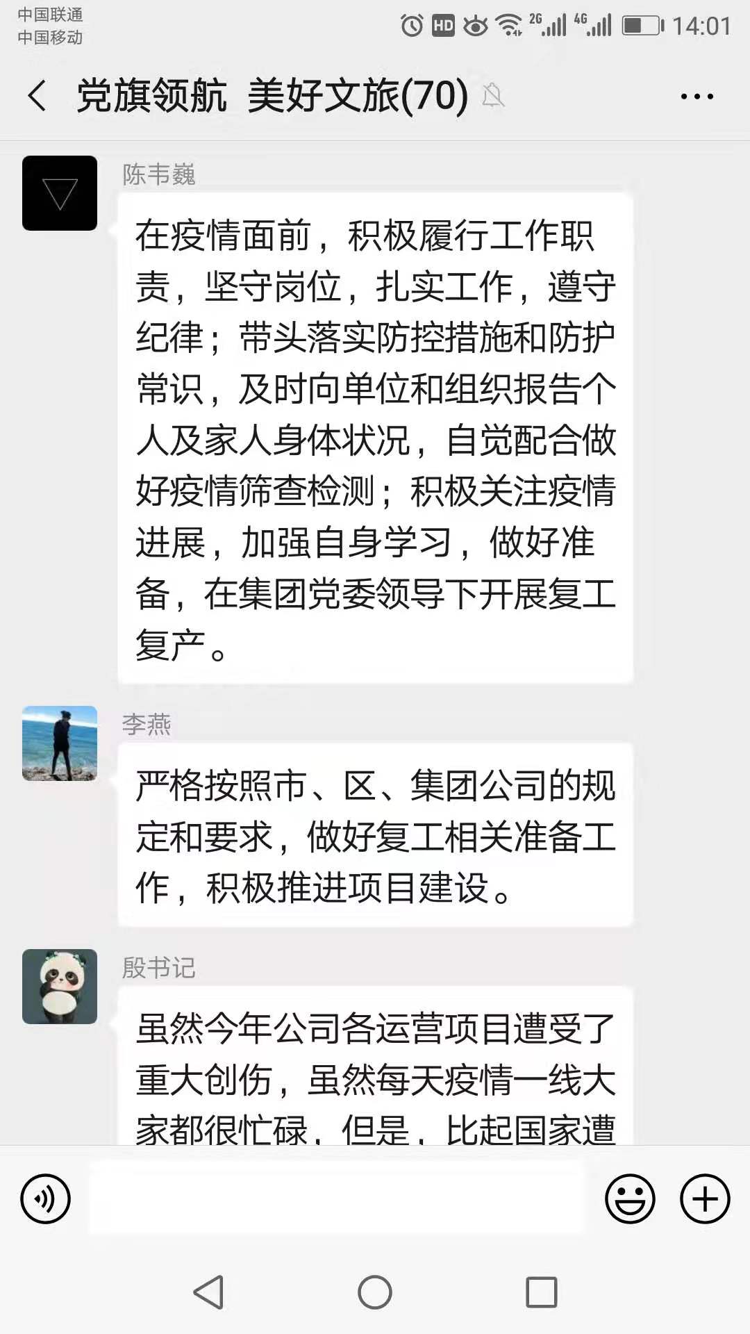 機(jī)關(guān)黨支部書記殷麗華在總結(jié)發(fā)言時(shí)強(qiáng)調(diào):全體黨員要通過學(xué)習(xí)討論,向身邊典型學(xué)習(xí),把實(shí)際行動落實(shí)到各自崗位中去,團(tuán)結(jié)一心、全力以赴做好當(dāng)前的抗疫工作。黨員同志紛紛表示,通過線上主題黨日活動,打破時(shí)間空間的限制在線學(xué)習(xí)和交流,實(shí)現(xiàn)防疫學(xué)習(xí)兩不誤的目標(biāo)。一定堅(jiān)決落實(shí)中央、省、市及集團(tuán)黨委的各項(xiàng)要求,勇于擔(dān)當(dāng)、勇于奉獻(xiàn),發(fā)揮共產(chǎn)黨員先鋒模范作用,為集團(tuán)公司規(guī)范提升和復(fù)工復(fù)產(chǎn)做出貢獻(xiàn)。