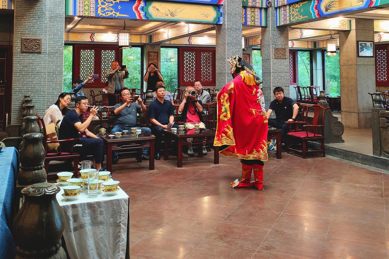 調(diào)研組一行先后參觀了蒙頂山世界茶文化博物館及從天蓋寺至皇茶園的茶文化景點(diǎn),欣賞川劇變臉、吐火、蒙頂山龍行十八式茶技表演,了解蒙頂山源遠(yuǎn)流長(zhǎng)的茶文化、茶馬文化。