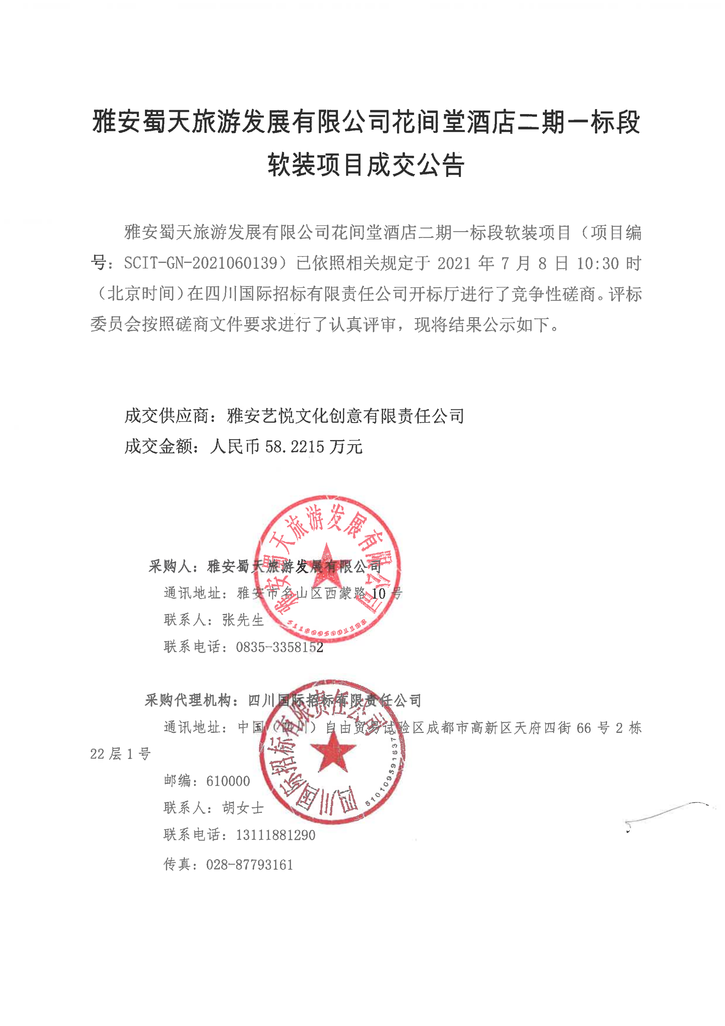 花間堂酒店二期一標(biāo)段軟裝項(xiàng)目成交公告