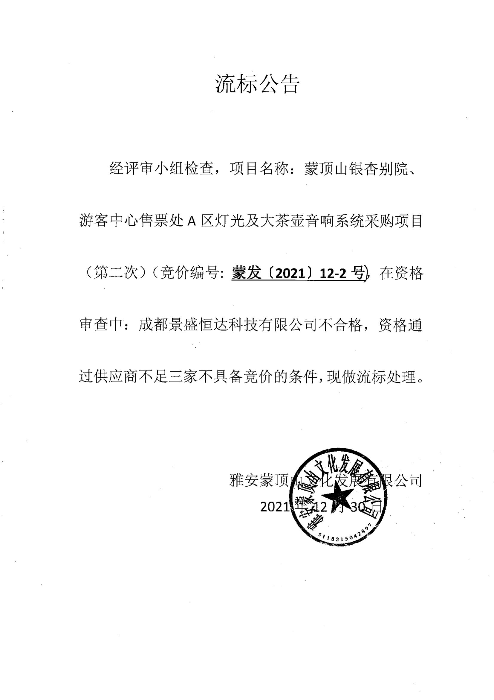蒙頂山銀杏別院、游客中心售票處A區(qū)燈光及大茶壺音響系統(tǒng)采購項目(第二次)流標公告