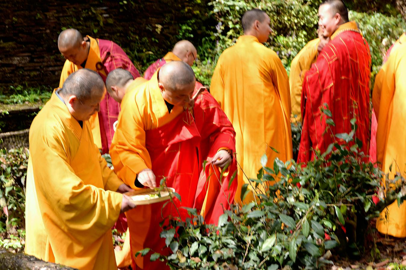 開園儀式上,在蒙頂五峰之心——皇茶園,由眾僧人灑凈、焚香、禮拜,然后入園采茶,再現(xiàn)了蒙頂山茶作為皇室貢品敬天祭祖的文化傳承和歷史輝煌。
