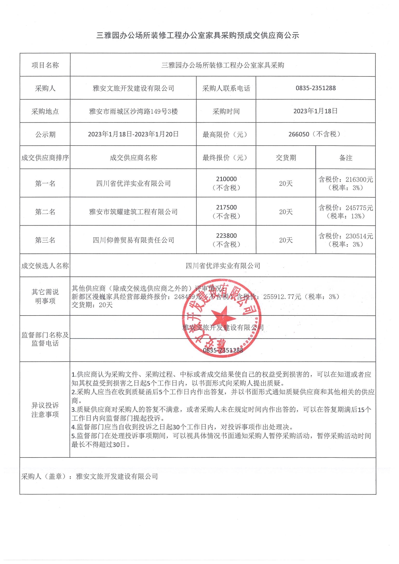 三雅園辦公場所裝修工程辦公室家具采購預(yù)成交候選人公示