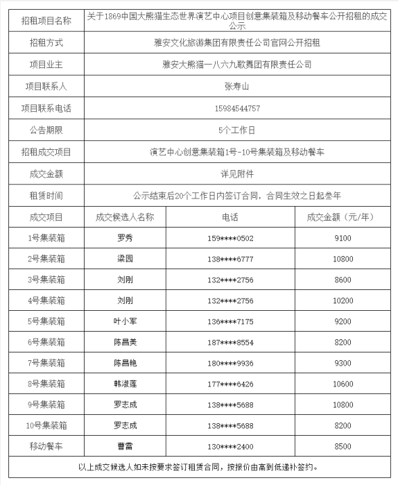 關(guān)于1869中國大熊貓生態(tài)世界演藝中心項(xiàng)目創(chuàng)意集裝箱及移動(dòng)餐車公開招租的成交公示